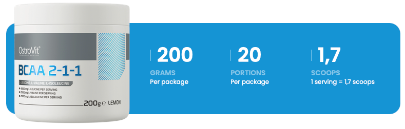 OstroVit BCAA 2-1-1 200g: Premium aminosyrer i et perfekt forhold til muskelrestitution, træthedsreduktion og fedtforbrænding. Ren, effektiv, uden unødvendige tilsætningsstoffer.