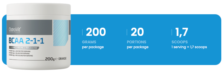 OstroVit BCAA 2-1-1 200g: Premium aminosyrer i et perfekt forhold til muskelrestitution, træthedsreduktion og fedtforbrænding. Ren, effektiv, uden unødvendige tilsætningsstoffer.
