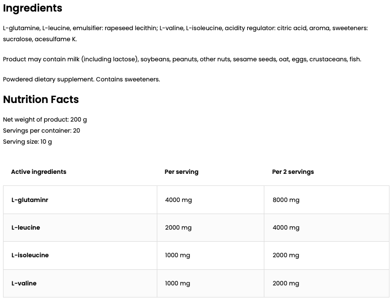 BCAA + Glutamin tilbyder en kraftfuld blanding af essentielle aminosyrer og L-glutamin for optimal muskelrestitution og vækst. Med en forfriskende grapefrugtsmag, ingen tilsat sukker.