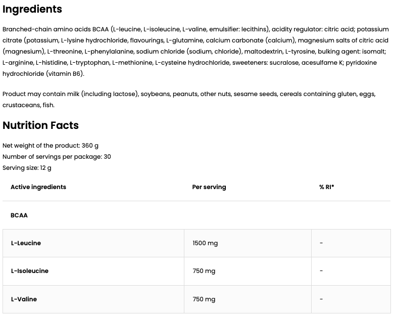 vertakte aminozuren BCAA (L‑leucine, L‑isoleucine, L‑valine, emulgator: lecithinen), zuurteregelaar (citroenzuur), kaliumcitraat (kalium), L‑lysine‑hydrochloride, aroma’s, L‑glutamine, calciumcarbonaat (calcium), magnesiumzouten van citroenzuur (magnesium), L‑threonine, L‑fenylalanine, natriumchloride (natrium, chloride), maltodextrine, L‑tyrosine, vulstof (isomalt), L‑arginine, L‑histidine, L‑tryptofaan, L‑methionine, L‑cysteïne‑hydrochloride, zoetstoffen (sucralose, acesulfaam‑K), pyridoxine‑hydrochloride (vitamine B6).
