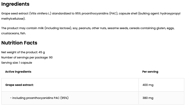 • Druivenpitextract (Vitis vinifera L.) – plantaardig extract, rijk aan proanthocyanidinen (OPC), een klasse polyfenolen; in dit product gestandaardiseerd op 95%.