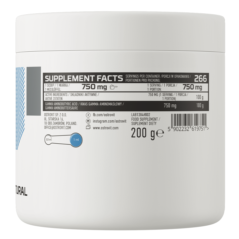 OstroVit GABA 200 g – 100% gamma‑aminoboterzuur. 266 porties à 750 mg. Neutrale smaak, zonder onnodige toevoegingen, vegan. Gebruik: 1× daags, poedervorm.