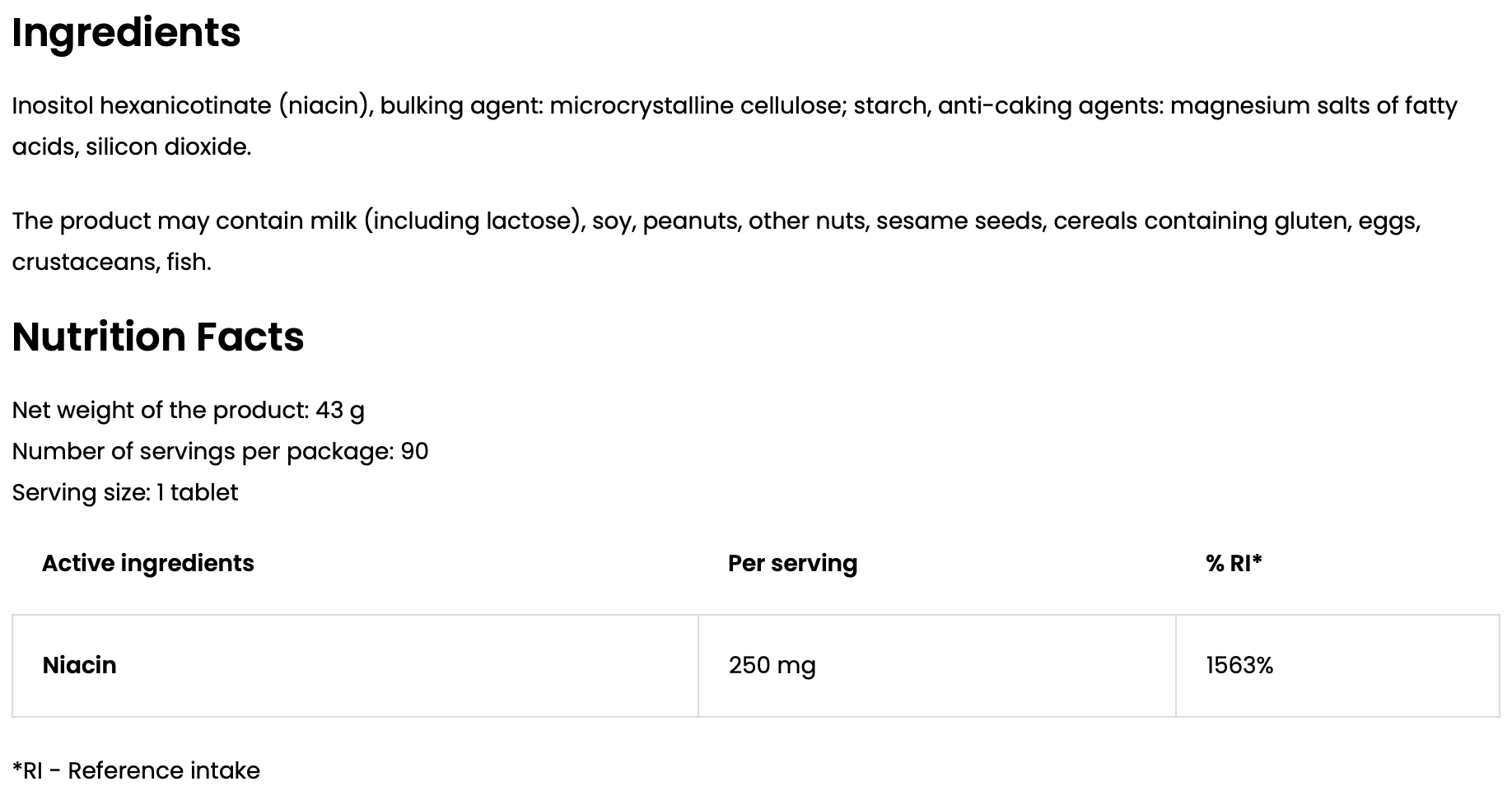 Niacin 250 mg NO‑FLUSH (B3) – 90 tabletten. 1 per dag. Draagt bij aan energiemetabolisme, huid en zenuwstelsel en helpt vermoeidheid te verminderen. Vegan.