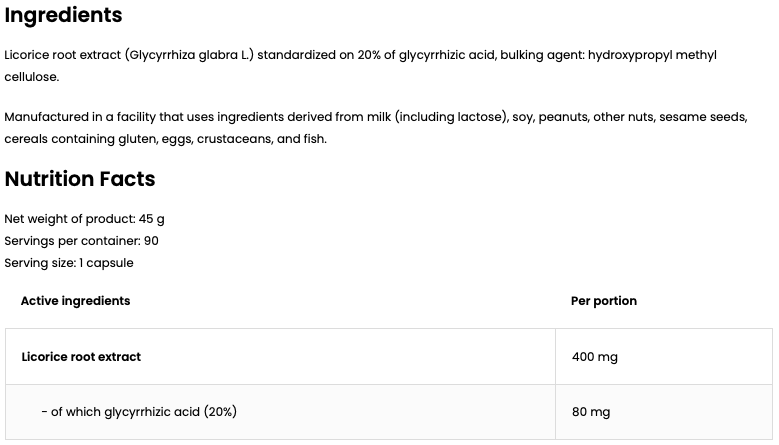 zoethoutwortel‑extract (Glycyrrhiza glabra L.) gestandaardiseerd op 20% glycyrrhizinezuur, capsuleschil (hydroxypropylmethylcellulose – HPMC).